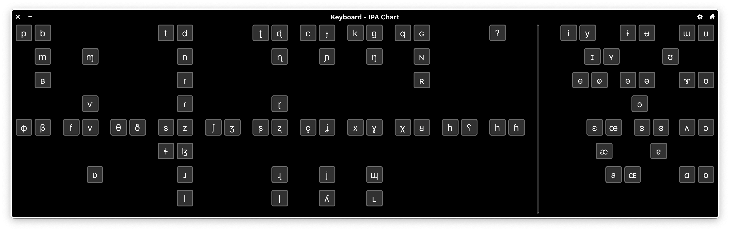 This keyboard layout was created with Panel Editor and is modeled after the official IPA Chart, with symbols arranged by place and manner of articulation. It’s not nearly as efficient as any of the aforementioned keyboard layouts (nor is it as complete), but anyone familiar with IPA can use it for transcription immediately without additional training.
