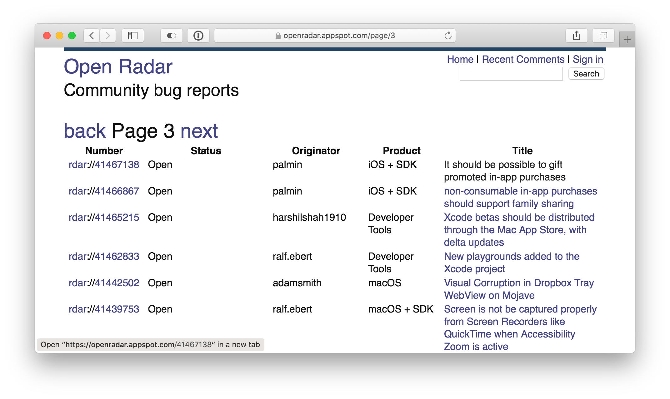 The fundamental problem with Radar as an external developer is lack of transparency. One of the ways this manifests itself is that there’s no way to know what anyone else has reported. All too often, you’ll invest a good deal of time writing up a detailed summary and creating a reproducible test case only to have the bug unceremoniously closed as a duplicate.