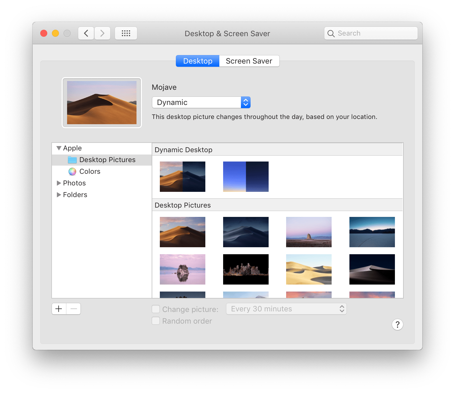 If you triangulate from those two macOS features, you get Dynamic Desktops, also new in Mojave. Now when you go to “System Preferences > Desktop & Screen Saver”, you have the option to select a “Dynamic” desktop picture that changes throughout the day, based on your location.